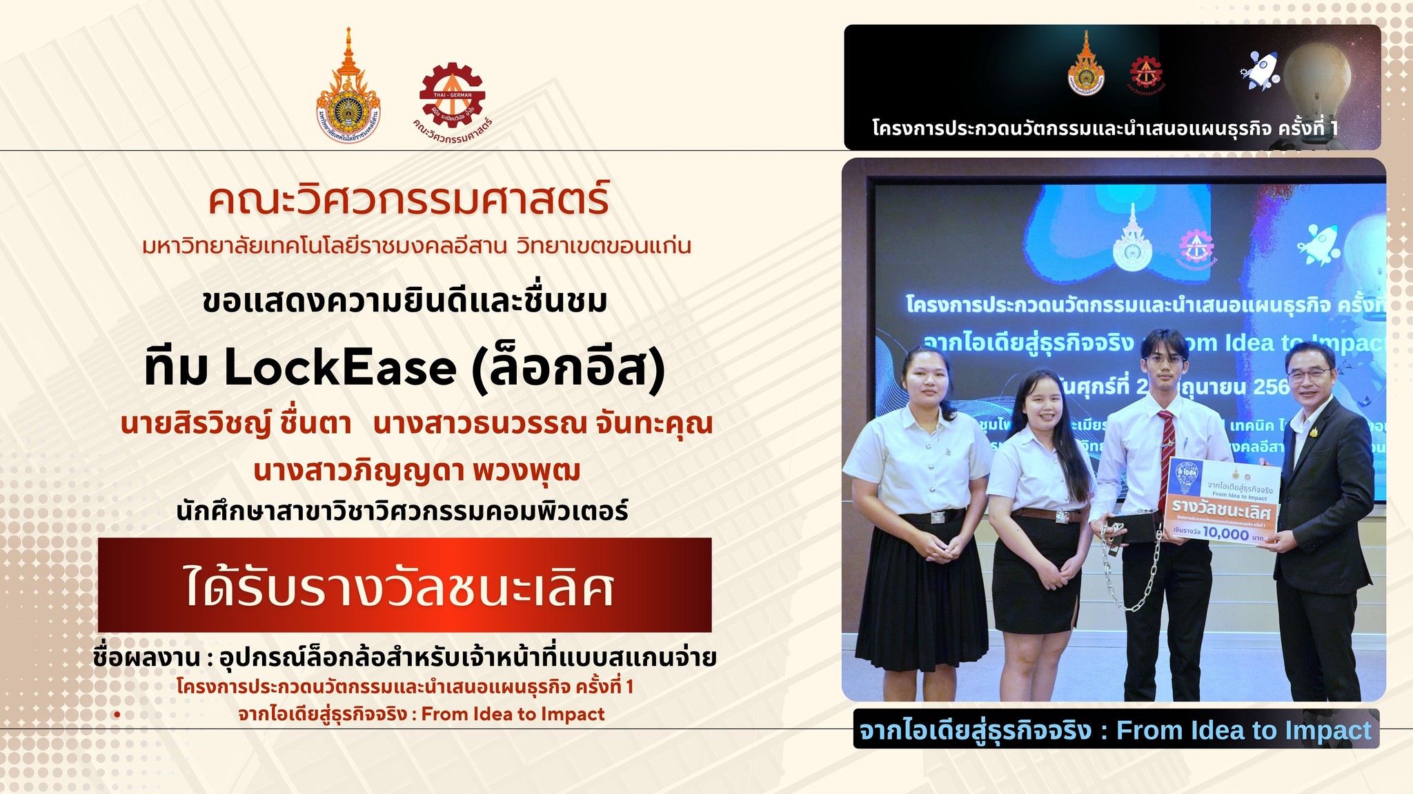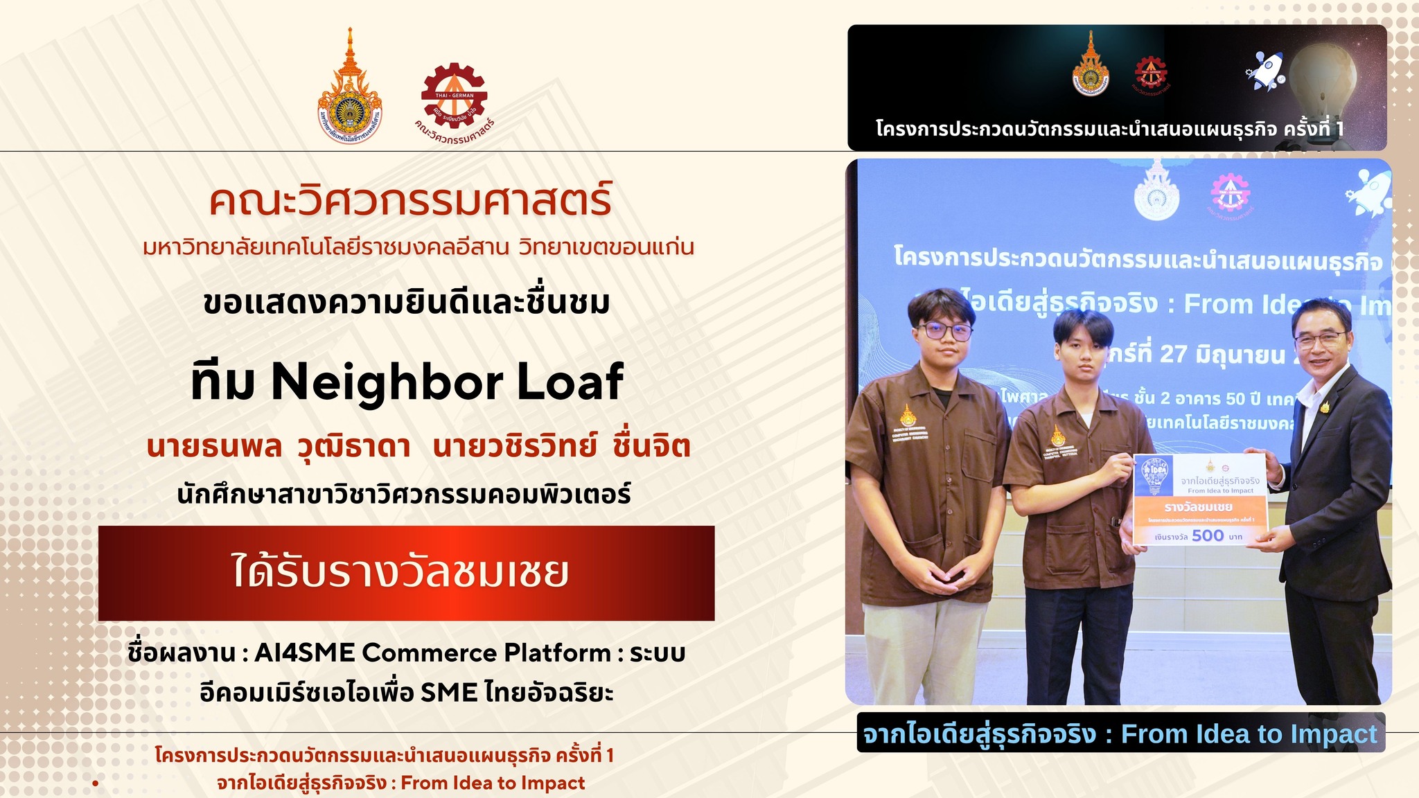 ขอแสดงความยินดีและชื่นชมนักศึกษาสาขาวิศวกรรมคอมพิวเตอร์ ในโอกาสที่ได้รับรางวัล โครงการประกวดนวัตกรรมและนำเสนอแผนธุรกิจ ครั้งที่ 1 จากไอเดียสู่ธุรกิจจริง : From Idea to Impact